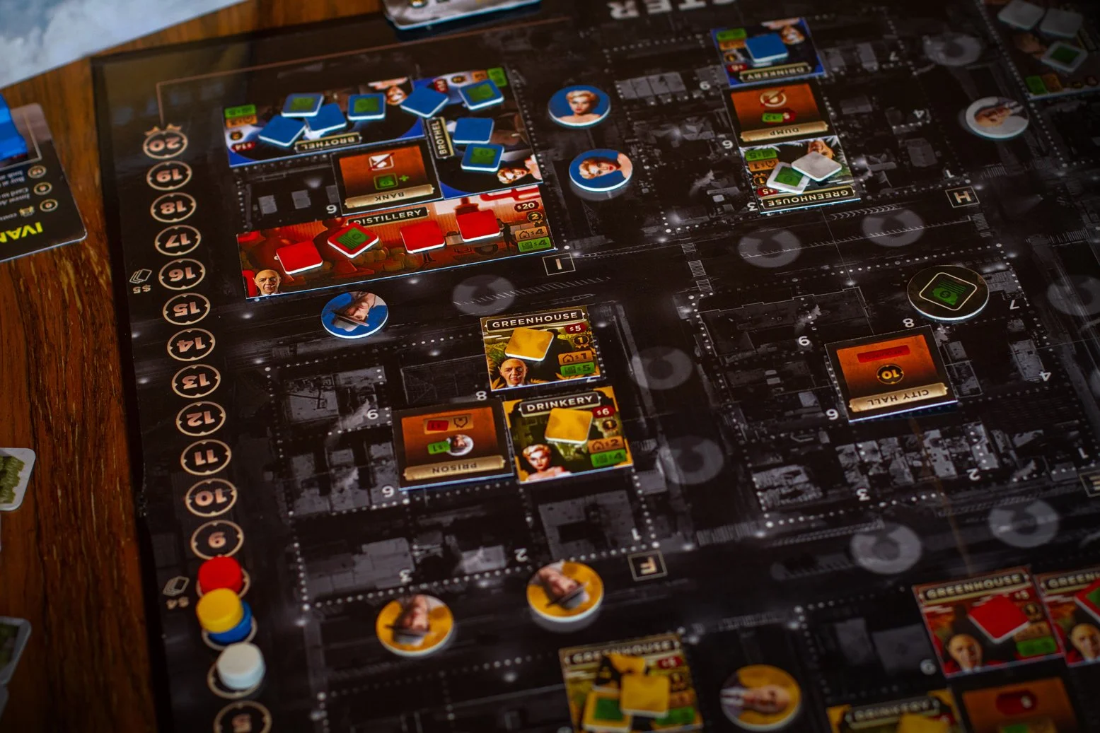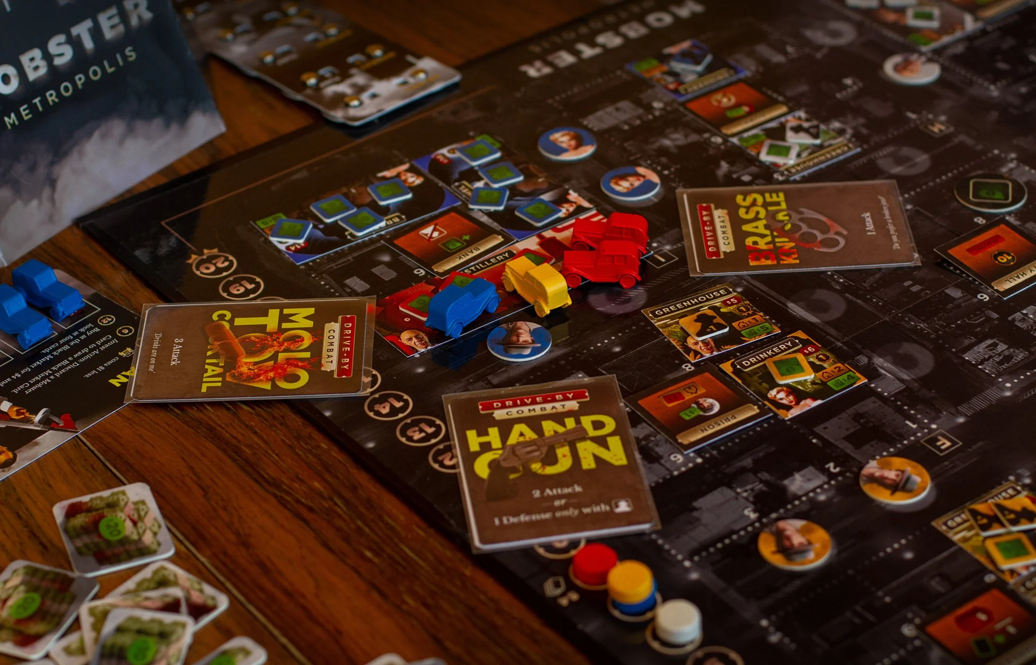 The game includes over 100 playing cards, a game board, more than 300 punchboard tokens, wooden discs and cars, custom-designed selectors, over 50 punchboard tiles for illegal businesses, 8 gangster characters, district punch tiles, player screens, and more.